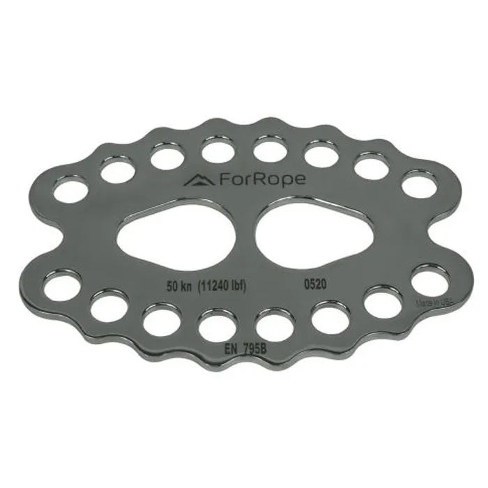 Possui 16 orifícios, sendo 8 na parte superior e 8 na parte inferior, possibilitando diversas configurações de conexão com cordas, fitas e mosquetões. Sua alta carga de ruptura de 50 kN atende com folga às exigências de aplicações críticas, sendo fabricada conforme a norma europeia EN 795 B.
